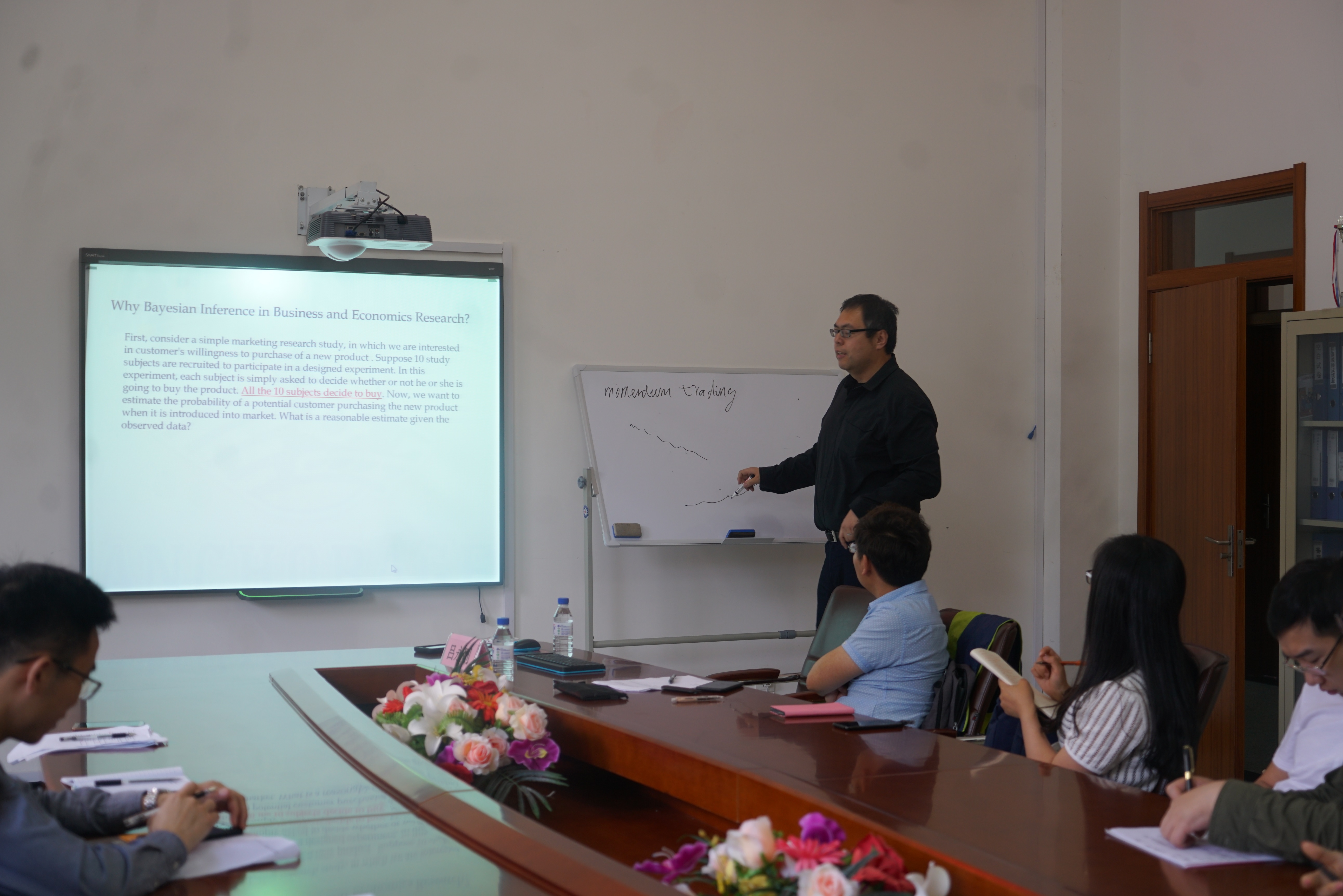 报告中,吕博士首先向大家介绍了贝叶斯定理,即关于随机事件A和B的条件概率(或边缘概率)的一则定理。并根据当今时代背景,分析商学研究于数据分析和建模的依赖关系。其次,指出在一般的情况下,人们习惯应用频率统计思考问题,但很多情况下是不符合现实意义的,因此应用贝叶斯理论更加贴切。不仅如此,统计中的p值和t统计量有时是并不准确的,吕博士运用Bayes Factor替代一般统计量,达到了更好的效果。在商业实例中,吕博士分析了两种市场非理性行为。首先是Bubble Experiment,对于泡沫,投资者虽然知道投资产品是无价值或低价值的,但是往往仍然会疯狂投机,试图得到超额的收益而不顾潜在飞速增长的风险。其次就是Momentum Trading,投资者会用惯性思维来思考问题,然而商业中很多现象并非线性的或者并非是有稳定长期趋势的,如果依然用这种惯性思维去投资是非常危险的。